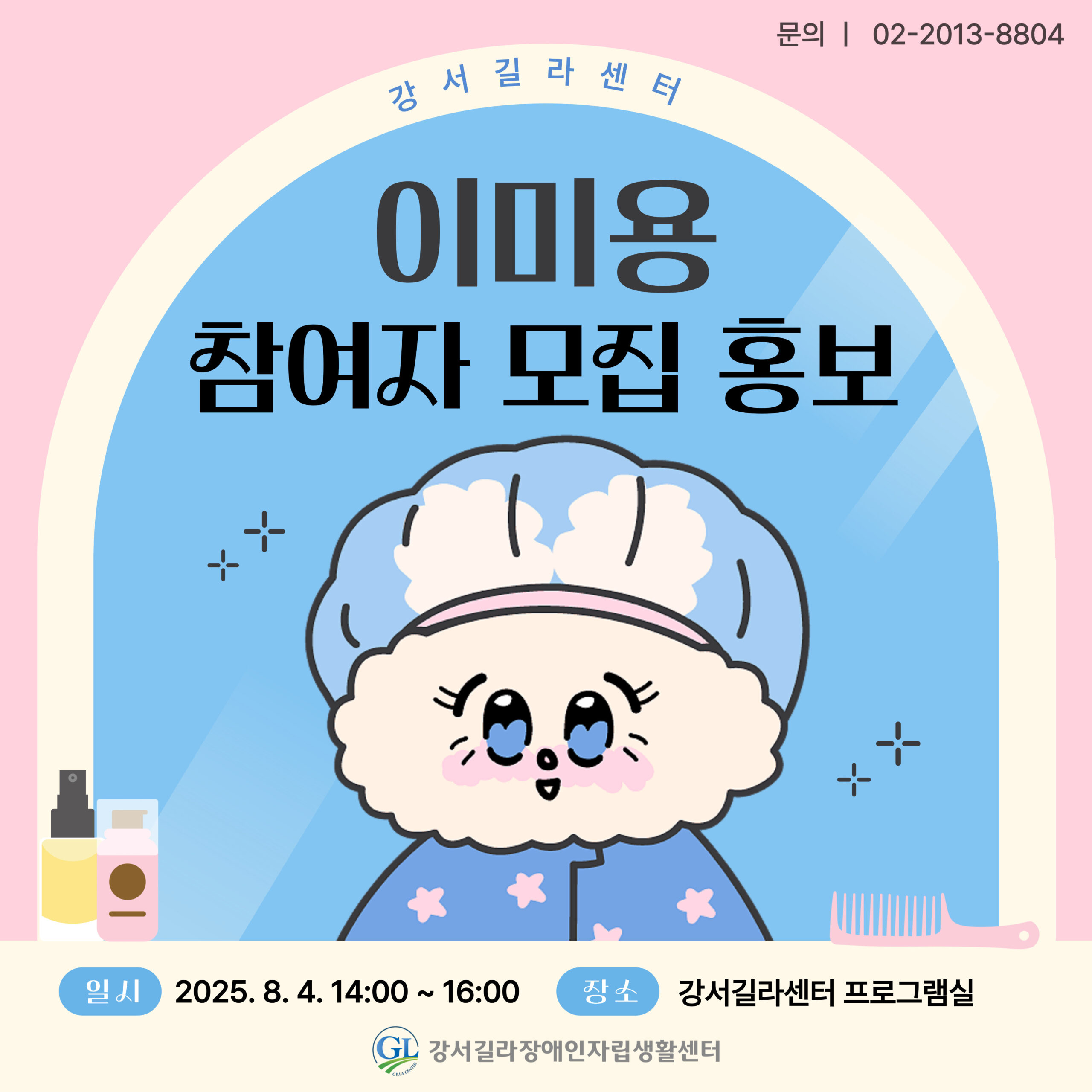 공지사항 이미용 참여자 모집 홍보 Updated on 2025-07-28 by 사무국 이미용 참여자를 모집합니다. 일시 : 2025. 8. 4.(월) 14:00 ~ 16:00 인원 : 선착순 10명내외 장소 : 강서길라장애인자립생활센터 프로그램실 문의 : 02-2013-8804 궁금하신점이 있으시면 언제든지 연락주세요!!
