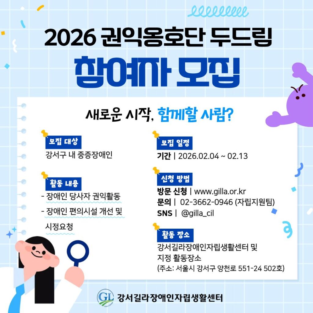 공지사항, 카드뉴스 2026년 권익옹호단 ‘두드림’ 참여자 모집 Updated on 2026-02-03 by 사무국 2026년 권익옹호단 두드림 참여자 모집 홍보 모집대상: 강서구 내 중증장애인 모집일정: 2026. 02. 04 ~ 02. 13. 활동내용: 장애인 당사자 권익활동 / 장애인 편의시설 개선 및 시정 요청 신청방법: 유선접수(02-3662-0946) 및 방문접수 많은 관심과 홍보 부탁드립니다. 감사합니다.