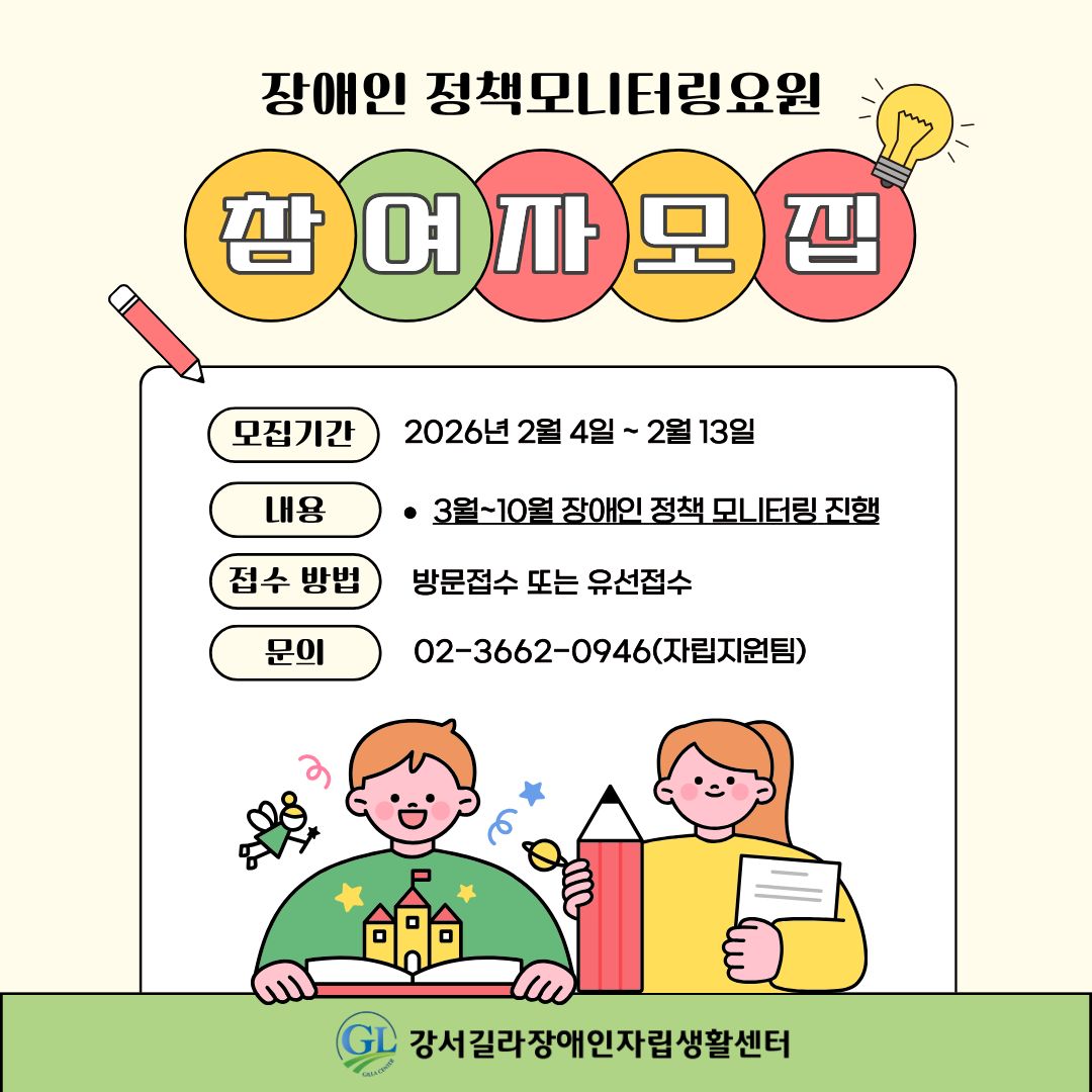 공지사항, 카드뉴스 2026년 장애인 정책모니터링 요원 모집 Updated on 2026-02-03 by 사무국 2026년 장애인 정책모니터링 요원 모집 홍보 모집기간: 2026년 2월 4일 ~ 2월 13일 내용: 3월 ~ 10월 장애인 정책모니터링 진행(8개월간) 접수방법: 방문접수 또는 유선접수 문의: 강서길라센터 자립지원팀(02-3662-0946) 많은 관심과 홍보 부탁드립니다!!
