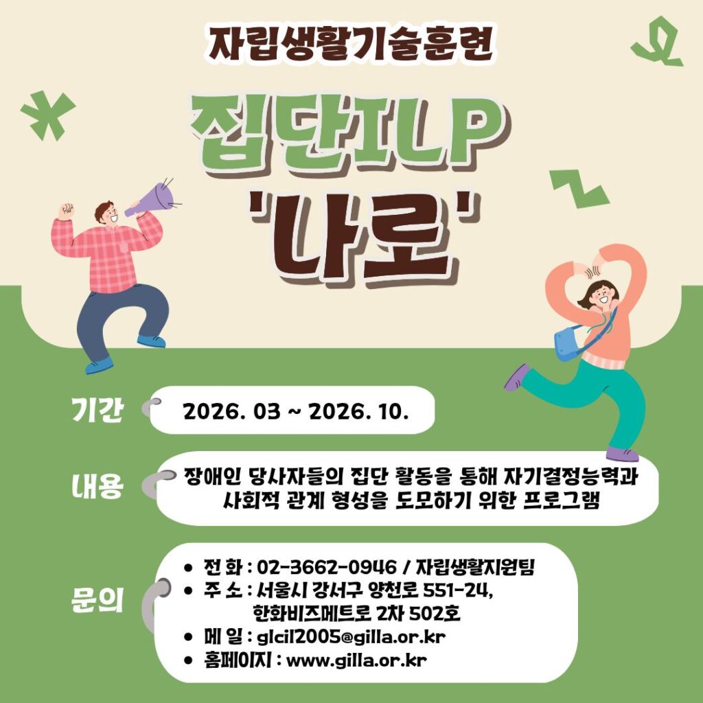 공지사항, 카드뉴스 2026년 집단ILP(나로) 참여자 모집 Updated on 2026-02-03 by 사무국 2026년 집단ILP(나로) 참여자 모집 홍보 모집기간: 2026년 2월 4일 ~ 2월 13일 내용: 장애인 당사자들의 집단 활동을 통해 자기결정능력과 사회적 관계 형성을 도모하기 위한 프로그램 문의: 강서길라센터 자립지원팀(02-3662-0946) 많은 관심과 홍보 부탁드립니다!!